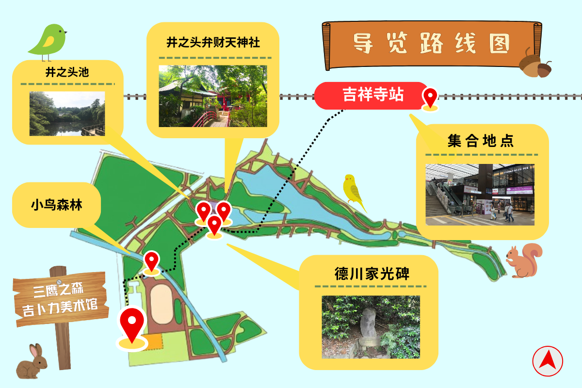 ・地标为京王线吉祥寺站改札口与JR吉祥寺站南口之间的电扶梯。集合地点位于JR吉祥寺站南口正前方电扶梯下方。