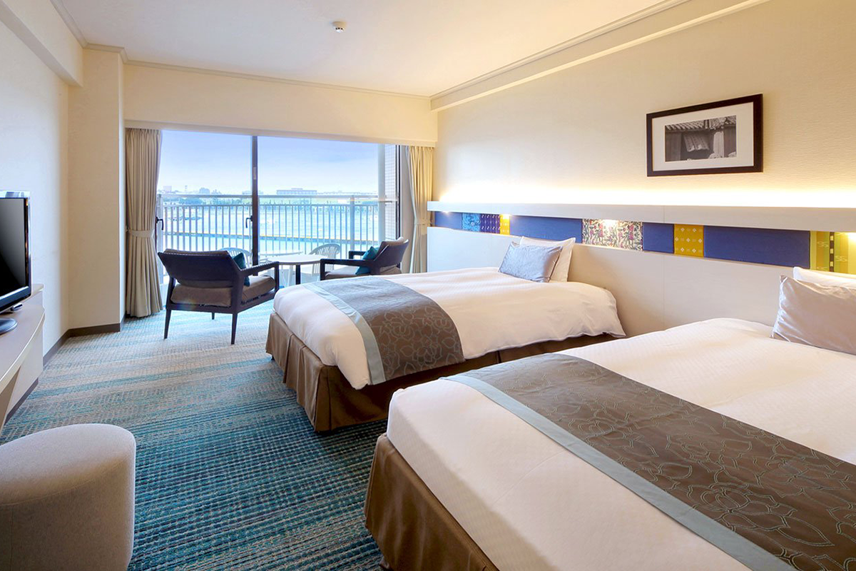 広々としたツインルームで、大きな窓からは沖縄の風を感じながら、那覇港に出入りする船や東シナ海に沈む美しい夕日をゆったりと眺めることができます。ホテル自慢の天然温泉やプール、充実したアメニティも備わっており、観光の疲れを癒すのに最適な空間です。自由時間の多い2日目は是非ともホテルを満喫ください。